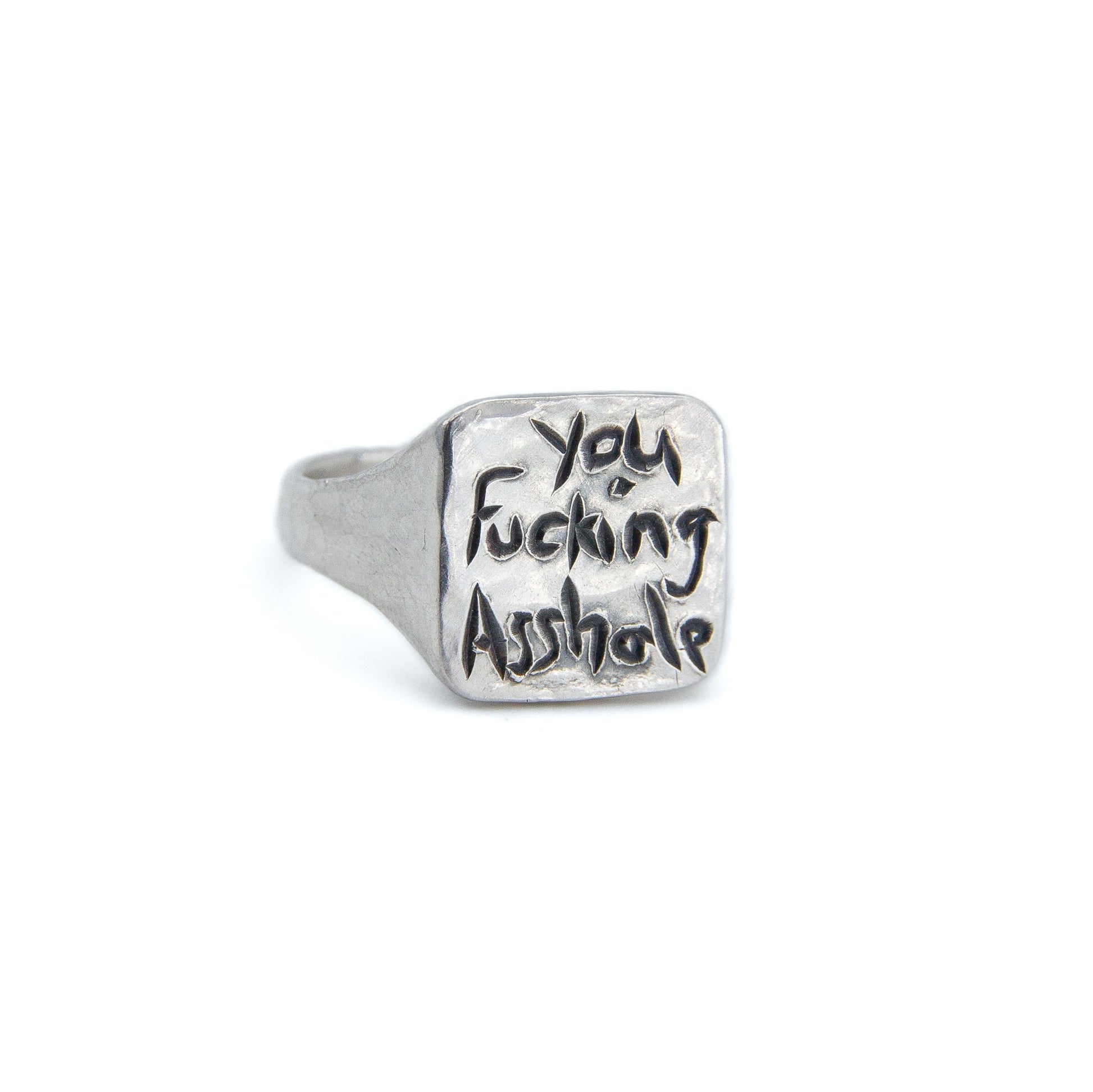 Die Domestizierung des inneren Tieres, der Wut, der Rage, ist ein Anliegen, das Menschen seit jeher eint. Beim Behämmern und Bearbeiten des Ringes wird die Aggression kanalisiert. Diese entladene Energie des Körpers und des Geistes überträgt sich auf das Material, ursprünglich Ausschussware und nun Gezeichnete der Resultate des Energietransfers. Der Ringrohling dient der kontrollierten emotionalen Entladung der Aggression. Der Energietransfer besänftigt Regina Rupp und Julian Arayapong die für diese Arbeit kooperierten. Beschimpfungen verlieren ihre schneidende Schärfe in der Abstraktion. Die Entfremdung des traditionell noblen Materials und Form zur Wut- und Stressbewältigung reiht sich ein in einen längerwierigen Prozess der Neuentdeckung und des Spieles de Künstler*innen mit Standesdünkel und Symbolobjekt.